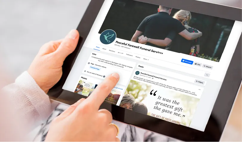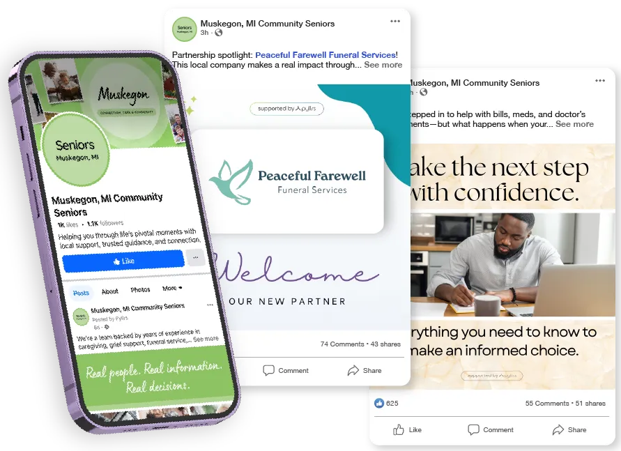 Mrs. Peterson follows your Facebook page for obituaries. Soon she also sees posts on grief support, preplanning, and memorial guidance. She notices your funeral home on the local Seniors Community Facebook page we manage, where your name appears alongside other professionals she already trusts.